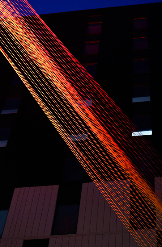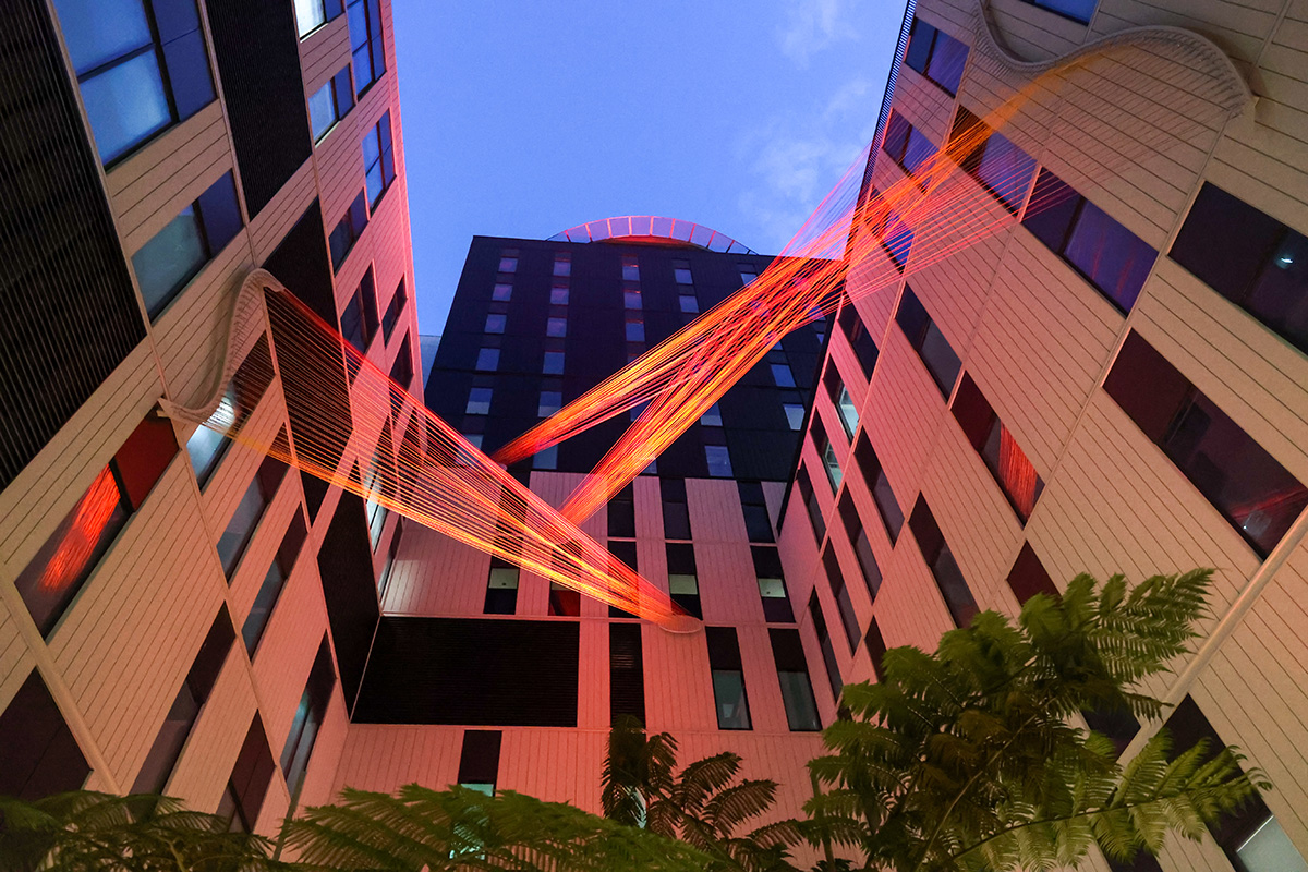 Shine is an artwork inspired by sunbeams glowing into the rainforest chasms of the nearby Blue Mountains and the healing power of light. Sunbeams are a natural phenomenon and a poetic metaphor for peace, hope and healing. Shine is the elegant resolution of engineering, art and architecture to arrive at a form that is both beautiful in form as well as efficient in materials. Located in the Internal Courtyard of Nepean Hospital it transforms the otherwise featureless void into a constantly shifting pattern of colour/ shadow and form. As an artwork that describes light, Shine exudes gentleness and warmth.