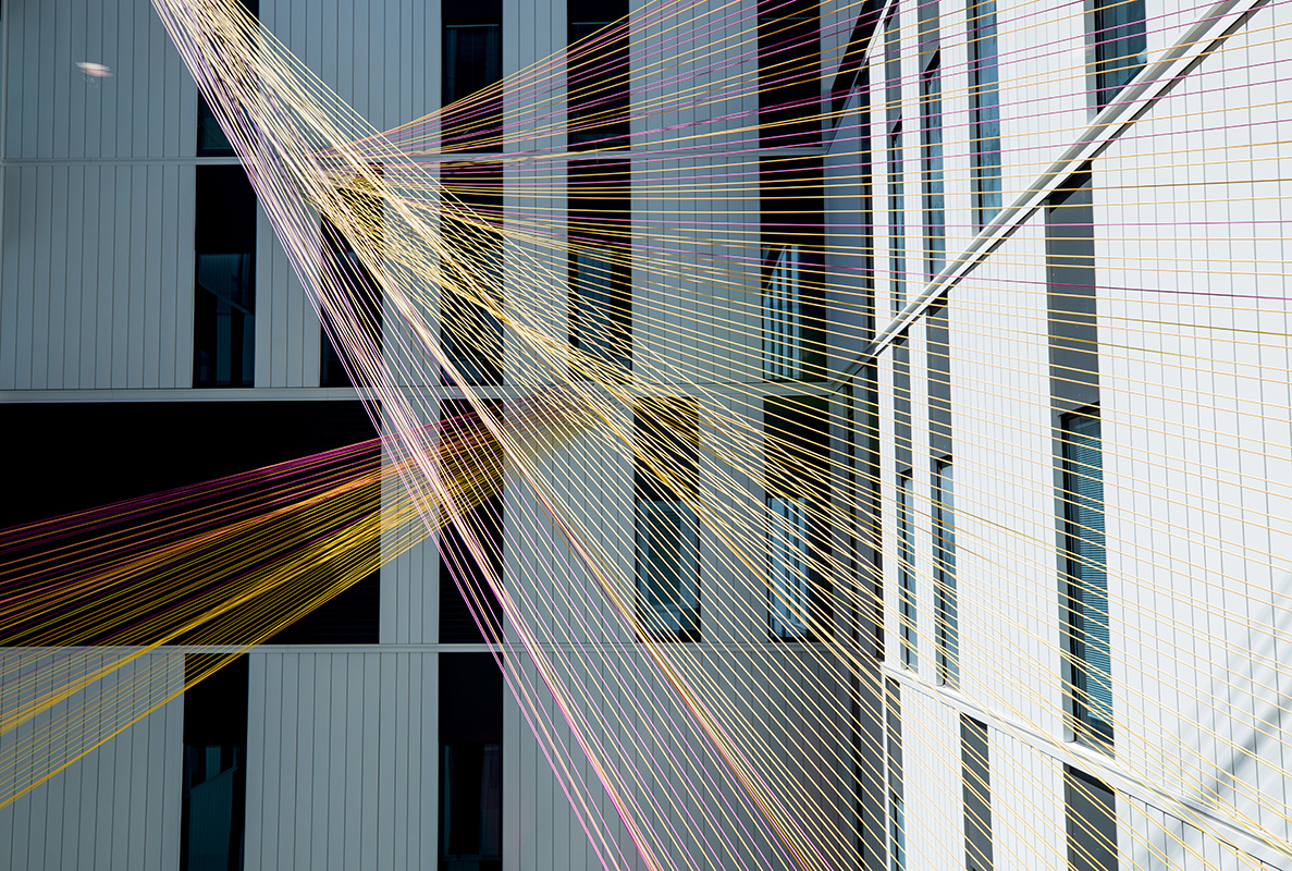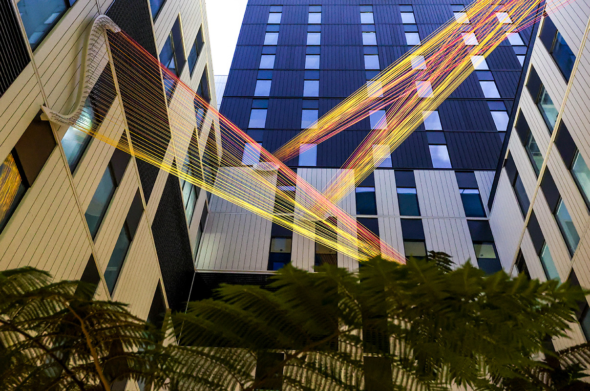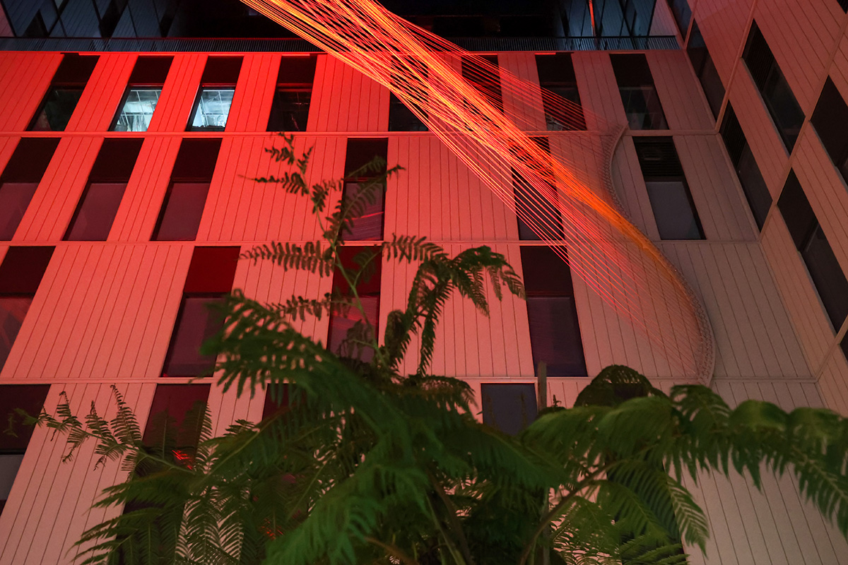 Shine is an artwork inspired by sunbeams glowing into the rainforest chasms of the nearby Blue Mountains and the healing power of light. Sunbeams are a natural phenomenon and a poetic metaphor for peace, hope and healing. Shine is the elegant resolution of engineering, art and architecture to arrive at a form that is both beautiful in form as well as efficient in materials. Located in the Internal Courtyard of Nepean Hospital it transforms the otherwise featureless void into a constantly shifting pattern of colour/ shadow and form. As an artwork that describes light, Shine exudes gentleness and warmth.